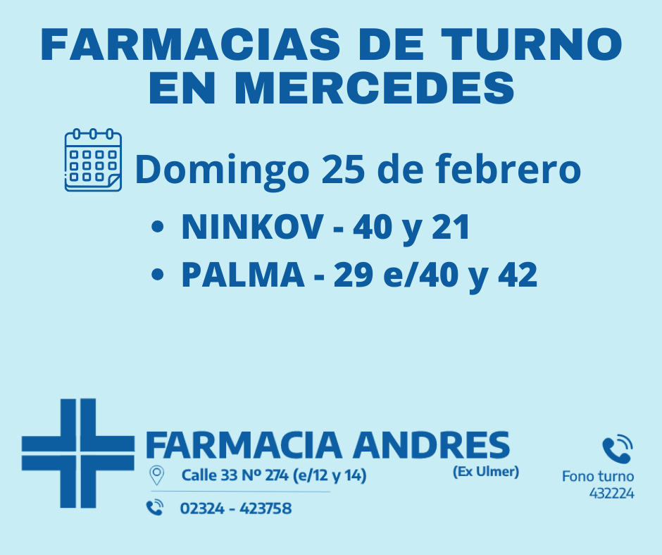 Farmacias de turno del domingo 25 de febrero 25 febrero, 2024Desde las 8:30 del día de hoy hasta la misma hora de mañana, las farmacias de turno en Mercedes son Ninkov y Palma.Comparte esto: Haz clic para compartir en WhatsApp (Se abre en una ventana nueva) WhatsApp Haz clic para compartir en Telegram (Se abre en una ventana nueva) Telegram Haz clic para compartir en X (Se abre en una ventana nueva) X Haz clic para compartir en Facebook (Se abre en una ventana nueva) Facebook TE PUEDE INTERESARCOMENTARIOS Comentarios