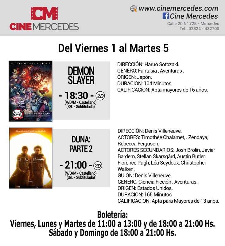Desde el viernes 1 de marzo, hasta el martes 5, el Cine Mercedes estrena dos películas de acción y aventuras. En la función de las 18:30 podrá verse el film japonés «Demon Slayer», mientras que en las funciones de la hora 21, podrá verse la segunda parte de «Duna».