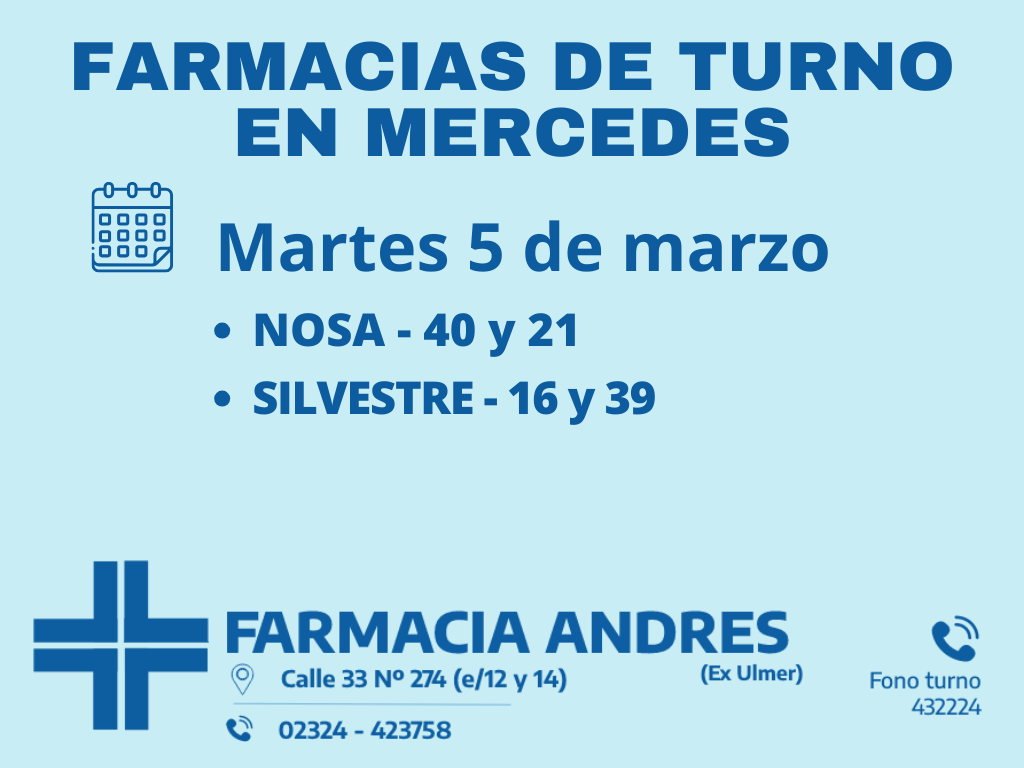 Farmacias de turno del martes 5 de marzo 5 marzo, 2024Desde las 8:30 del día de hoy hasta la misma hora de mañana, las farmacias de turno en Mercedes son: Nosa y Silvestre.Comparte esto: Haz clic para compartir en WhatsApp (Se abre en una ventana nueva) WhatsApp Haz clic para compartir en Telegram (Se abre en una ventana nueva) Telegram Haz clic para compartir en X (Se abre en una ventana nueva) X Haz clic para compartir en Facebook (Se abre en una ventana nueva) Facebook TE PUEDE INTERESARCOMENTARIOS Comentarios