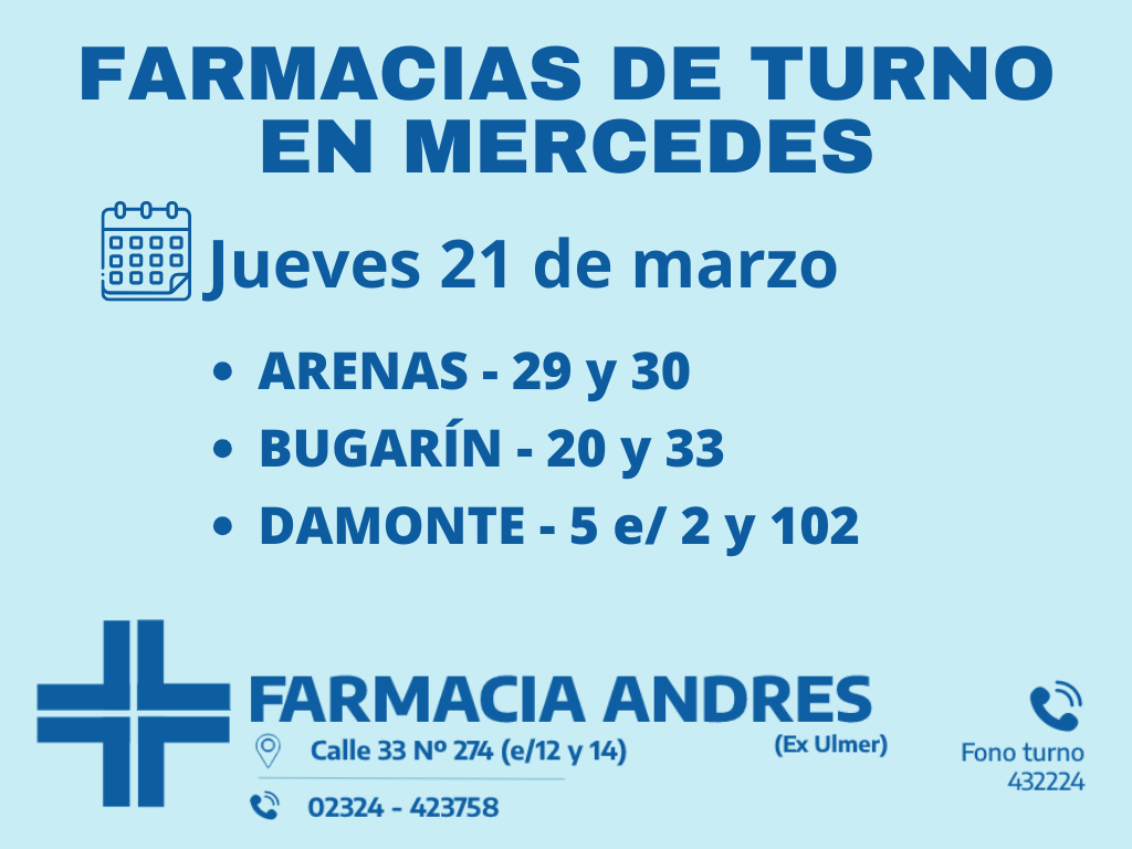 Desde las 8:30 del día de hoy hasta la misma hora de mañana, las farmacias de turno en Mercedes son: Arenas, Bugarín y Damonte.