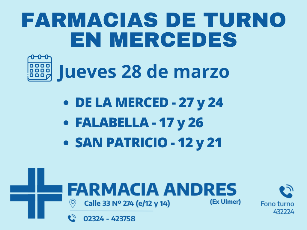 Desde las 8:30 del día de hoy hasta la misma hora de mañana las farmacias de turno en Mercedes son De la Merced, San Patricio y Falabella.