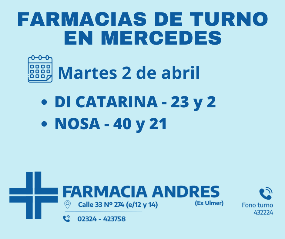 Desde las 8:30 del día de hoy hasta la misma hora de mañana las farmacias de turno en Mercedes son Di Catarina y Nosa.