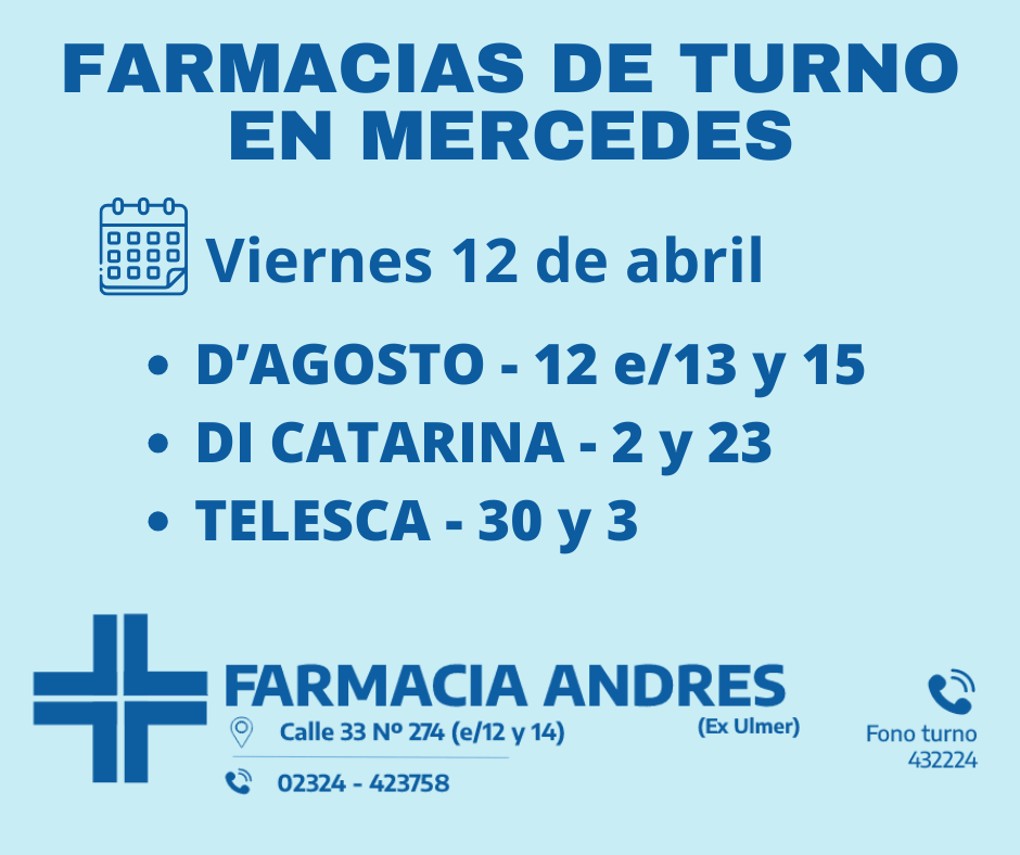 Desde las 8:30 del día de hoy hasta la misma hora de mañana, las farmacias de turno en Mercedes son: D’Agosto, Di Catarina y Telesca.