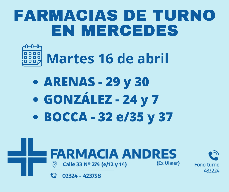 Farmacias de turno del martes 16 de abril 16 abril, 2024Desde las 8 30 del día de hoy hasta la misma hora de mañana las farmacias de turno en Mercedes son Arenas, González y BoccaComparte esto: Haz clic para compartir en WhatsApp (Se abre en una ventana nueva) WhatsApp Haz clic para compartir en Telegram (Se abre en una ventana nueva) Telegram Haz clic para compartir en X (Se abre en una ventana nueva) X Haz clic para compartir en Facebook (Se abre en una ventana nueva) Facebook TE PUEDE INTERESARCOMENTARIOS Comentarios