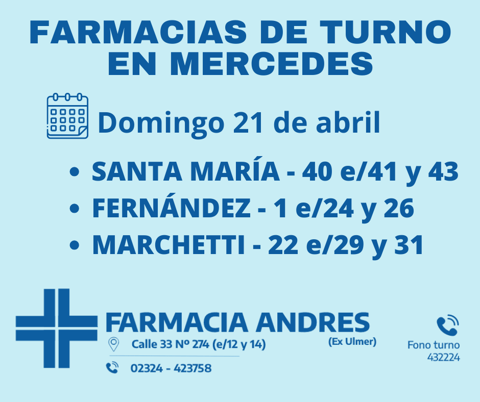 Desde las 8:30 del día de hoy hasta la misma hora de mañana, las farmacias de turno en Mercedes son Santa María, Fernández y Marchetti.