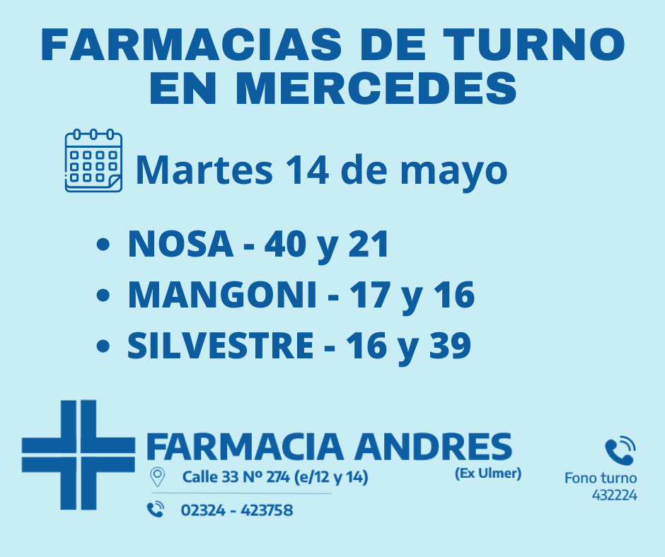 Desde las 8 30 del día de hoy hasta la misma hora de mañana las farmacias de turno en Mercedes son Nosa, Silvestre y Mangoni