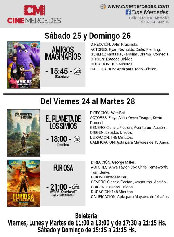 Desde el viernes 24 de mayo, hasta el martes 28, el Cine Mercedes propone en su pantalla tres películas. Continúan en cartelera «Amigos Imaginarios» y la nueva versión de «El Planeta de los Simios» a lo que suman «Furiosa».