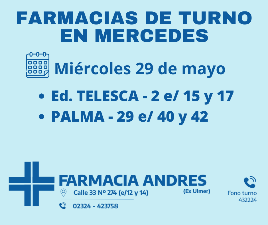 Farmacias de turno del miércoles 29 de mayo 29 mayo, 2024Desde las 8:30 del día de hoy hasta la misma hora de mañana las farmacias de turno en Mercedes son Eduardo Telesca y PalmaComparte esto: Haz clic para compartir en WhatsApp (Se abre en una ventana nueva) WhatsApp Haz clic para compartir en Telegram (Se abre en una ventana nueva) Telegram Haz clic para compartir en X (Se abre en una ventana nueva) X Haz clic para compartir en Facebook (Se abre en una ventana nueva) Facebook TE PUEDE INTERESARCOMENTARIOS Comentarios