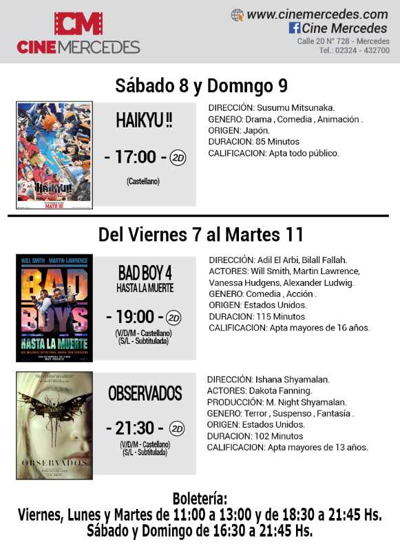 Desde el viernes 7 al martes 11de junio, podrán verse tres películas diferentes en el Cine Mercedes. En las funciones de la hora 19, llega una nueva película de «Bad Boys», mientras que a las 21:30 el terror llega de la mano de «Observados». En tanto, el sábado y el domingo se agrega la película japonesa de animación «Haikyu!» a la hora 17.