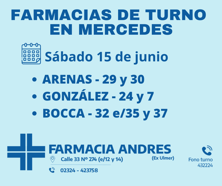 Farmacias de turno del sábado 15 de junio 15 junio, 2024Desde las 8 30 del día de hoy hasta la misma hora de mañana las farmacias de turno en Mercedes son Arenas, González y BoccaComparte esto: Haz clic para compartir en WhatsApp (Se abre en una ventana nueva) WhatsApp Haz clic para compartir en Telegram (Se abre en una ventana nueva) Telegram Haz clic para compartir en X (Se abre en una ventana nueva) X Haz clic para compartir en Facebook (Se abre en una ventana nueva) Facebook TE PUEDE INTERESARCOMENTARIOS Comentarios
