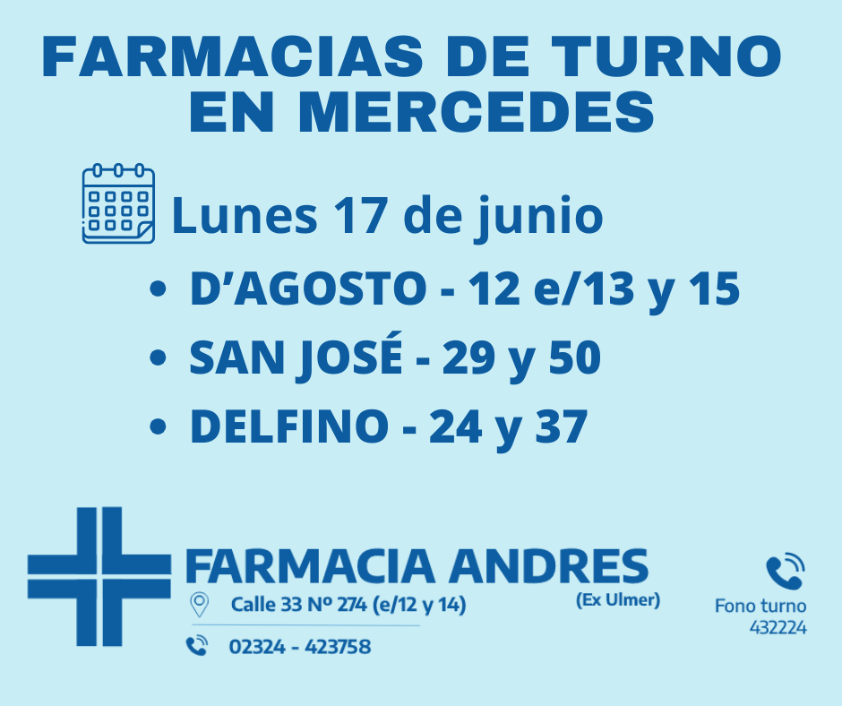 Desde las 8:30 del día de hoy hasta la misma hora de mañana, las farmacias de turno en Mercedes son: D’Agosto, San José y Delfino