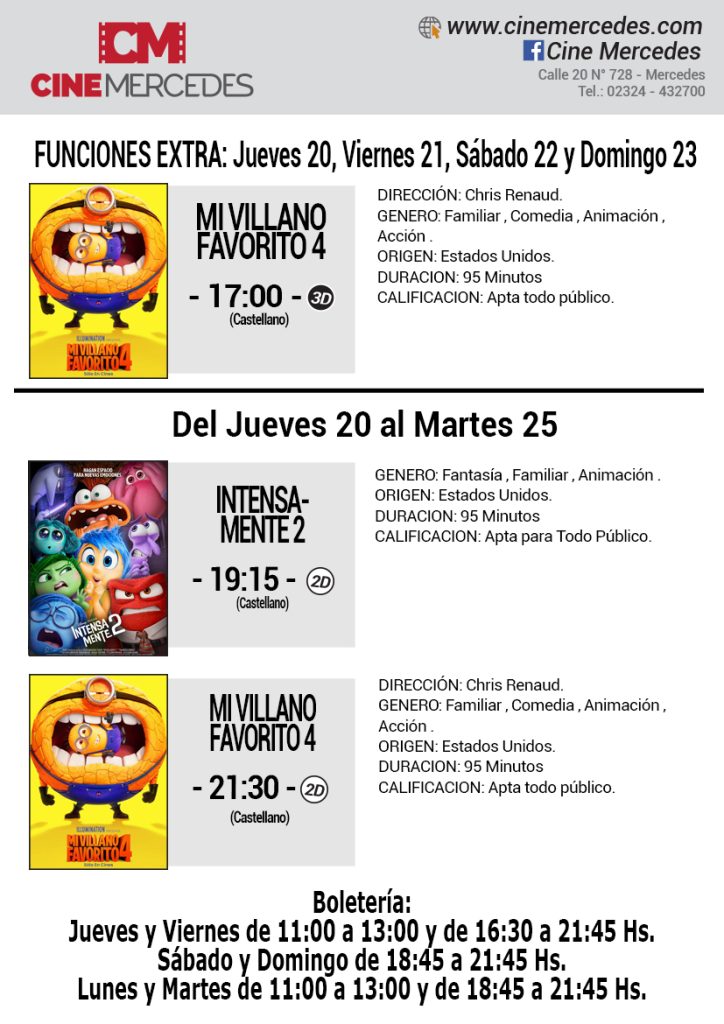 El Cine Mercedes extiende los días de función a partir del fin de semana largo y esto derivó en miles de espectadores que colmaron la sala para ver las dos películas de animación más esperadas del año. Las entradas están agotadas para casi la totalidad de las funciones, pero comenzó la venta de entradas para la semana del 27 de junio. Desde el jueves 20 de junio y hasta el martes 25 de junio se presenta Mi Villano Favorito 4 y la segunda parte de Intensamente.