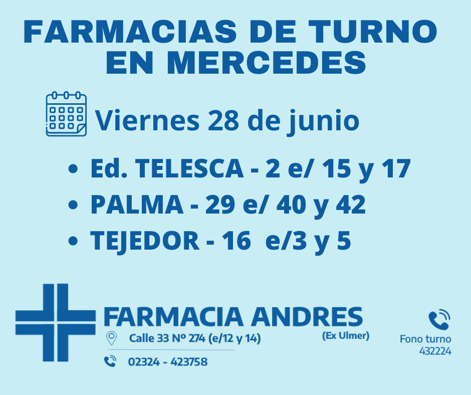 Desde las 8:30 del día de hoy hasta la misma hora de mañana, las farmacias de turno en Mercedes son: Eduardo Telesca, Palma y Tejedor