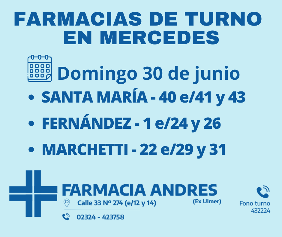 Desde las 8 30 del día de hoy hasta la misma hora de mañana las farmacias de turno en Mercedes son Santa María, Fernández y Marchetti