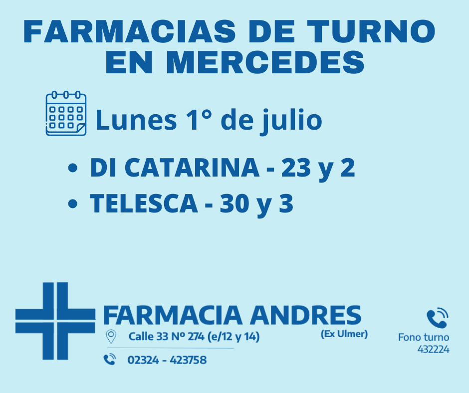 Farmacias de turno del lunes 1 de julio 1 julio, 2024Desde las 8:30 del día de hoy hasta la misma hora de mañana, las farmacias de turno en Mercedes son: Di Catarina y Telesca.Comparte esto: Haz clic para compartir en WhatsApp (Se abre en una ventana nueva) WhatsApp Haz clic para compartir en Telegram (Se abre en una ventana nueva) Telegram Haz clic para compartir en X (Se abre en una ventana nueva) X Haz clic para compartir en Facebook (Se abre en una ventana nueva) Facebook TE PUEDE INTERESARCOMENTARIOS Comentarios