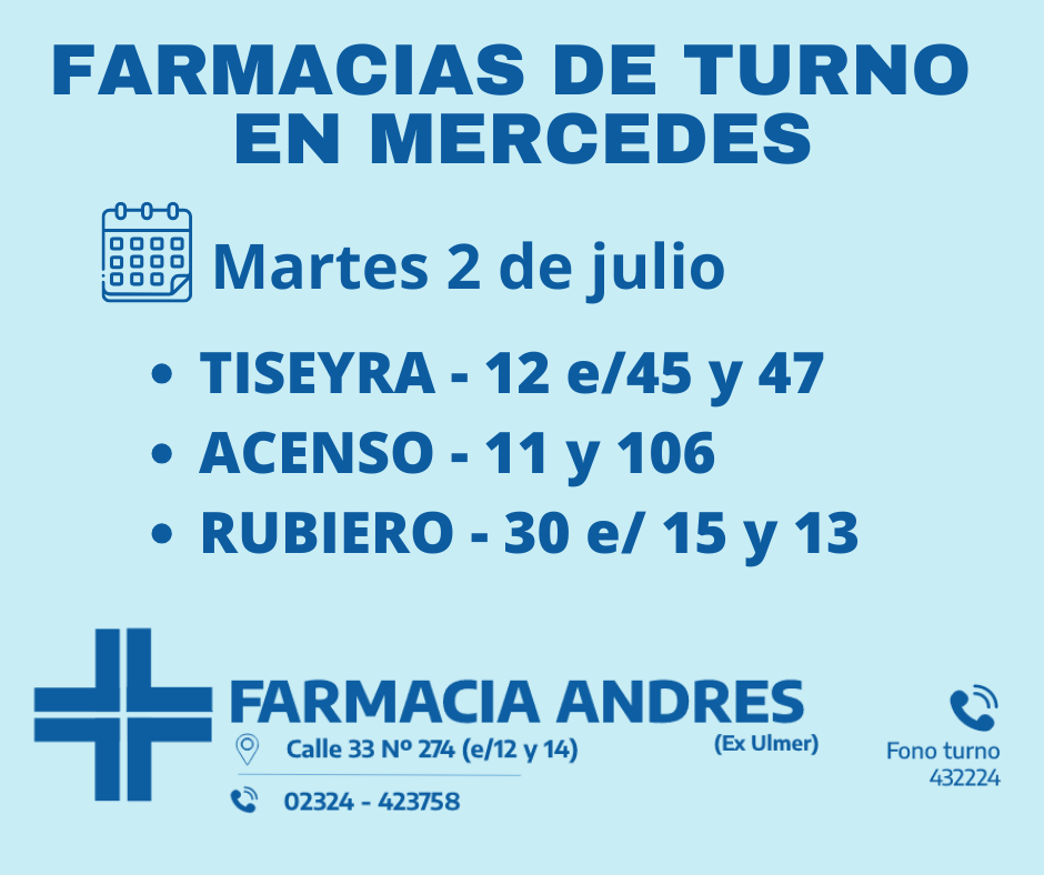 Desde las 8:30 del día de hoy hasta la misma hora de mañana, las farmacias de turno en Mercedes son: Tiseyram Acenso y Rubiero