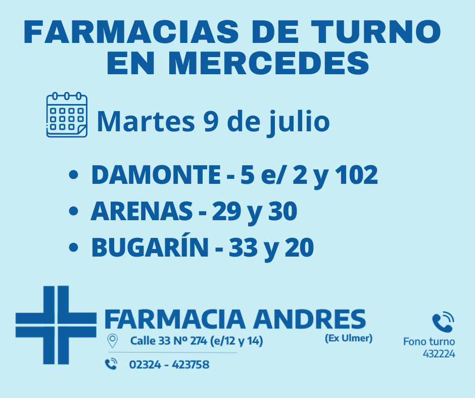 Desde las 8:30 del día de hoy hasta la misma hora de mañana, las farmacias de turno en Mercedes son: Damonte, Arenas y Bugarín.