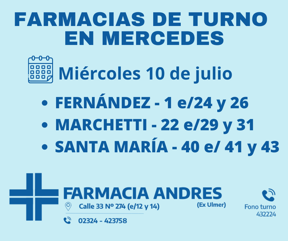 Desde las 8 30 del día de hoy hasta la misma hora de mañana las farmacias de turno en Mercedes son Fernández, Marchetti y Santa María