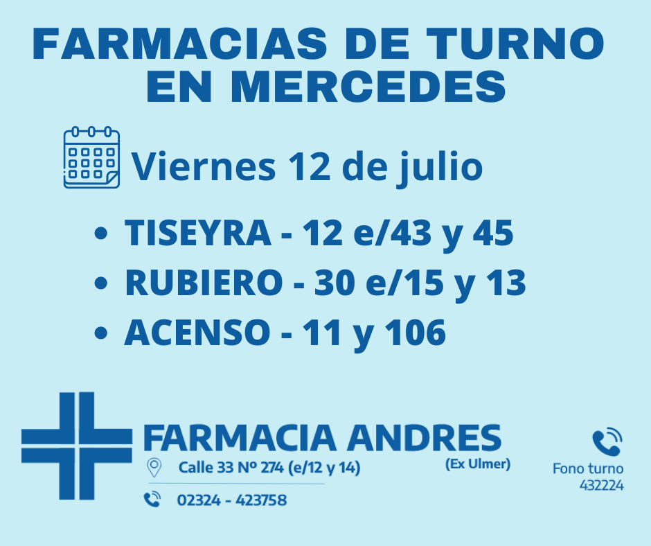 Farmacias de turno del viernes 12 de julio 12 julio, 2024Desde las 8:30 del día de hoy hasta la misma hora de mañana las farmacias de turno en Mercedes son Tiseyra, Rubiero y AcensoComparte esto: Haz clic para compartir en WhatsApp (Se abre en una ventana nueva) WhatsApp Haz clic para compartir en Telegram (Se abre en una ventana nueva) Telegram Haz clic para compartir en X (Se abre en una ventana nueva) X Haz clic para compartir en Facebook (Se abre en una ventana nueva) Facebook TE PUEDE INTERESARCOMENTARIOS Comentarios