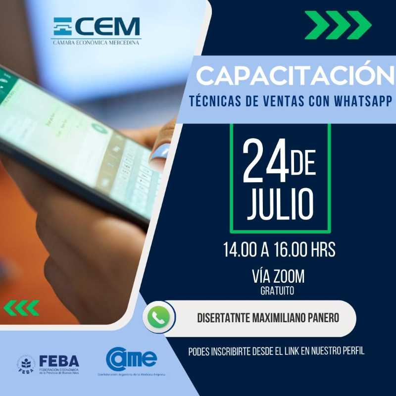 La Cámara Económica Mercedina (CEM) invita a emprendedores y profesionales del comercio a participar de una capacitación virtual gratuita sobre “Técnicas de Ventas con WhatsApp”. La actividad, que cuenta con el apoyo de la Confederación Argentina de la Mediana Empresa (CAME), se llevará a cabo el próximo 24 de julio de 14:00 a 16:00 horas a través de la plataforma Zoom.