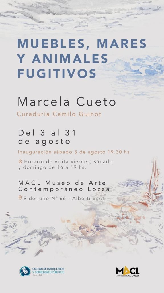 Desde el sábado 3 de agosto, la artista plástica mercedina Marcela Cueto estará exponiendo sus últimos trabajos que fueron curados por otro artista plástico mercedino multipremiado Camilo Guinot. En esta oportunidad, Marcela expondrá en el Museo de Alberti la muestra titulada «Muebles, mares y animales fugitivos».