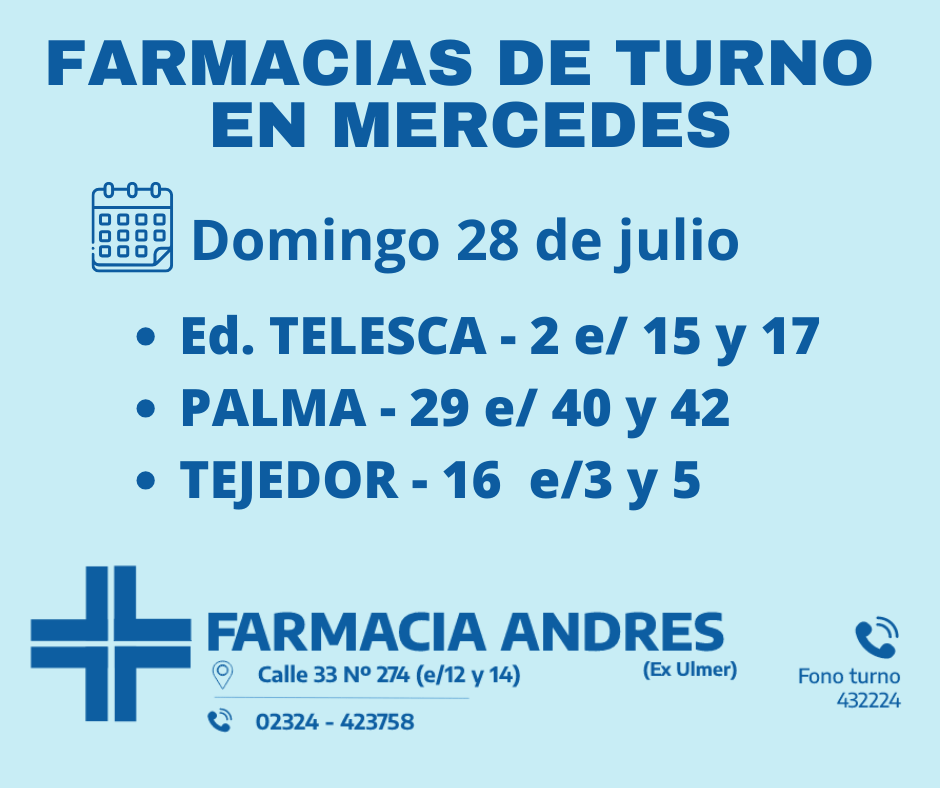 Desde las 8 30 del día de hoy hasta la misma hora de mañana las farmacias de turno en Mercedes son Eduardo Telesca, Palma y Tejedor