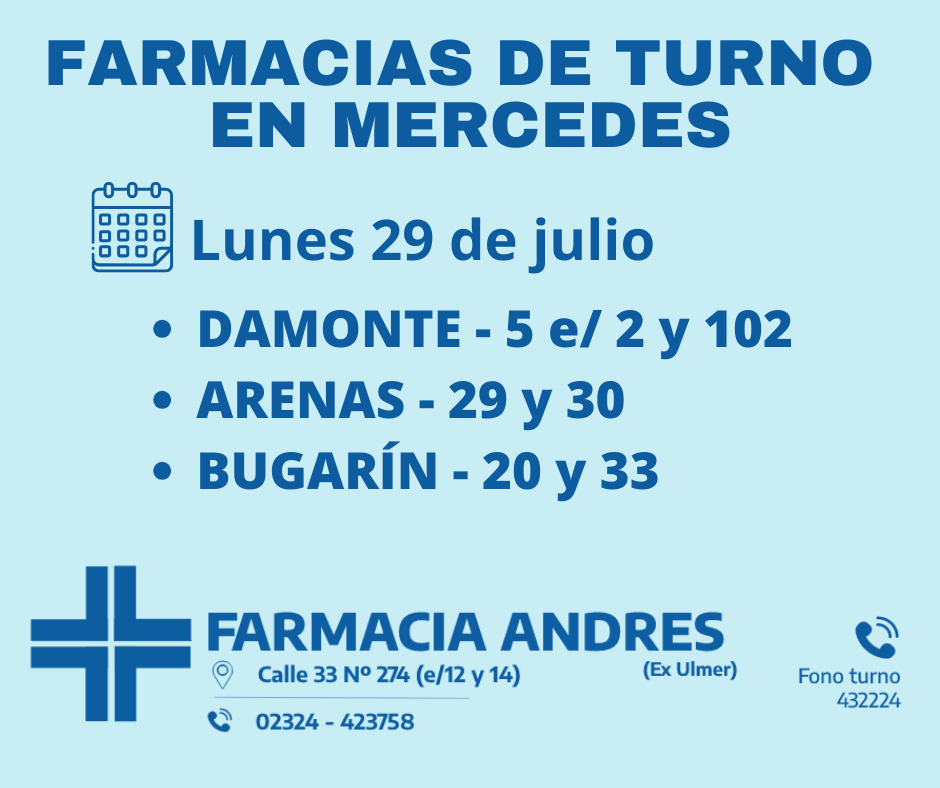 Farmacias de turno del lunes 29 de julio 29 julio, 2024Desde las 8:30 del día de hoy hasta la misma hora de mañana las farmacias de turno en Mercedes son Damonte, Arenas y BugarinComparte esto: Haz clic para compartir en WhatsApp (Se abre en una ventana nueva) WhatsApp Haz clic para compartir en Telegram (Se abre en una ventana nueva) Telegram Haz clic para compartir en X (Se abre en una ventana nueva) X Haz clic para compartir en Facebook (Se abre en una ventana nueva) Facebook TE PUEDE INTERESARCOMENTARIOS Comentarios