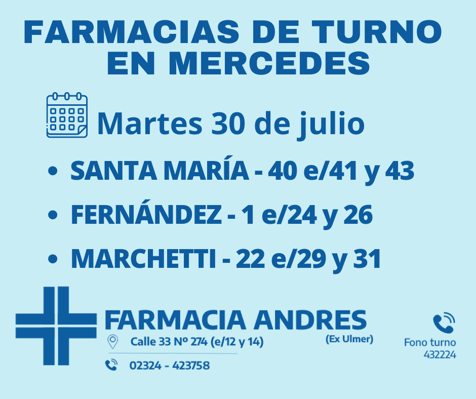 Desde las 8 30 del día de hoy hasta la misma hora de mañana las farmacias de turno en Mercedes son Santa María, Fernández y Marchetti