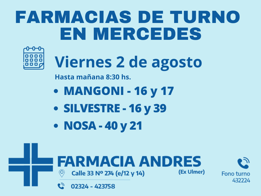 Desde las 8:30 del día de hoy hasta la misma hora de mañana, las farmacias de turno en Mercedes son: Mangoni, Silvestre y Nosa.