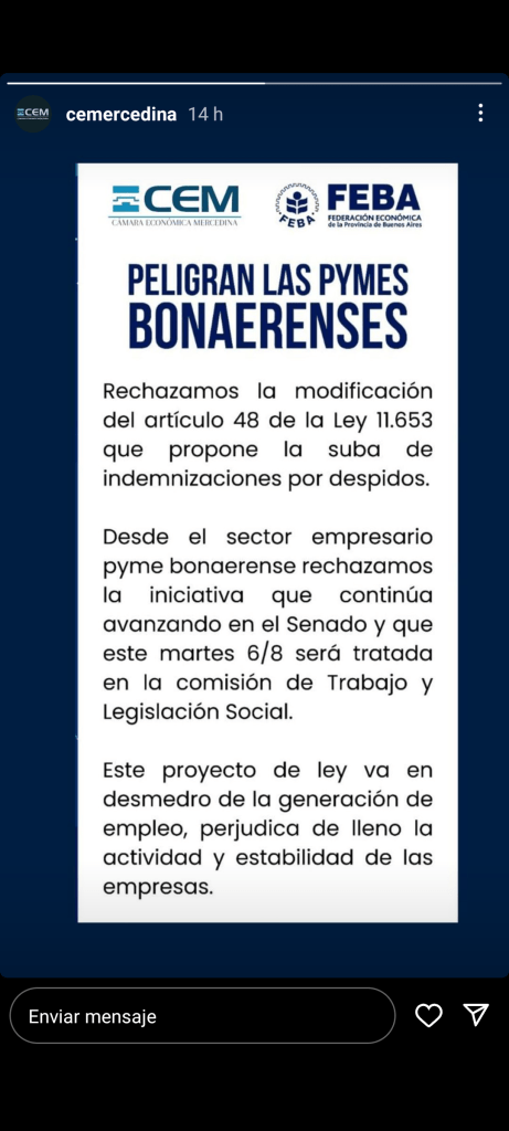 En su texto, «la Cámara Económica Mercedina expresó su total apoyo a la postura de la Federación Económica de la Provincia de Buenos Aires (FEBA) en rechazo a la modificación del artículo 48 de la Ley 11.653, que propone un aumento en las indemnizaciones por despidos».
