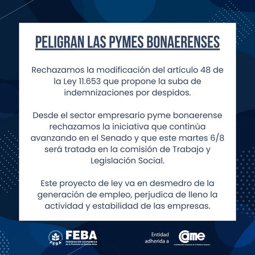 A través de una comunicación enviada a los medios y publicados en las redese sociales, la Cámara Económica Mercedina afirma y respalda a FEBA (Federación Económica de la provincia de Buenos Aires) en el rechazo a la suba de indemnizaciones por despidos, propuesta realizada por el gobierno bonaerense. y aseguran «Peligran las PyMEs Bonaerenses».