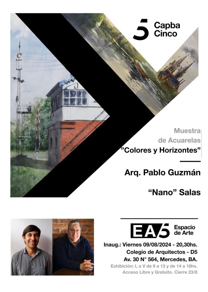 El Colegio de Arquitectos – Distrito 5 hace extensiva la invitación para una nueva muestra de arte que abre sus puertas el venidero viernes 9 de agosto, 20:30 hs. En esta oportunidad expondrán los artistas Arq. Pablo Guzmán y «Nano» Salas con su muestra de acuarelas titulada ”Colores y Horizontes”.