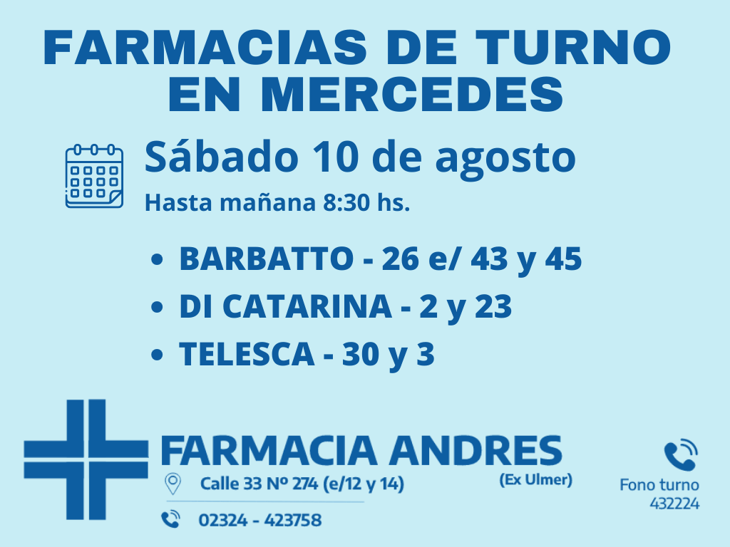 Desde las 8 30 del día de hoy hasta la misma hora de mañana las farmacias de turno en Mercedes son Barbatto, Di Catarina y Telesca.