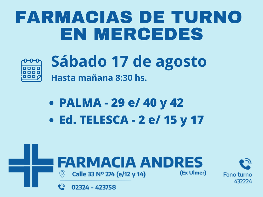 Desde las 8:30 del día de hoy hasta la misma hora de mañana, las farmacias de turno en Mercedes son: Palma y Eduardo Telesca.