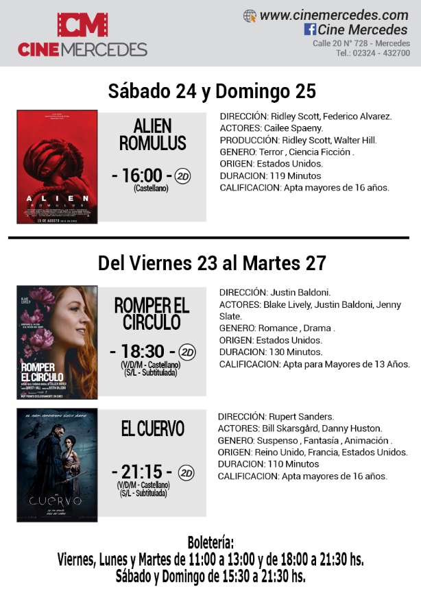 Desde el viernes 23 las martes 27 de agosto, el Cine Mercedes presenta tres películas para el fin de semana. Siguen en cartelera Alien Romulus y Romper el Círculo, a lo que suman «El Cuervo».