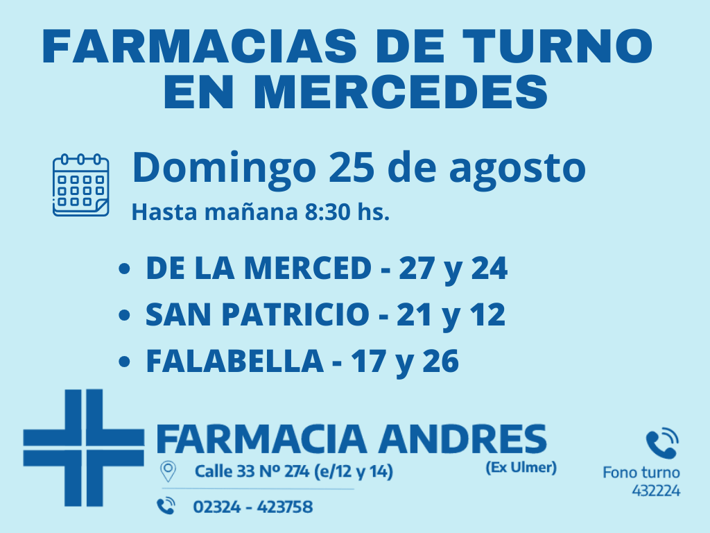 Desde las 8;30 del día de hoy hasta la misma hora de mañana, las farmacias de turno en Mercedes son: De la Merced, San Patricio, y Falabella.