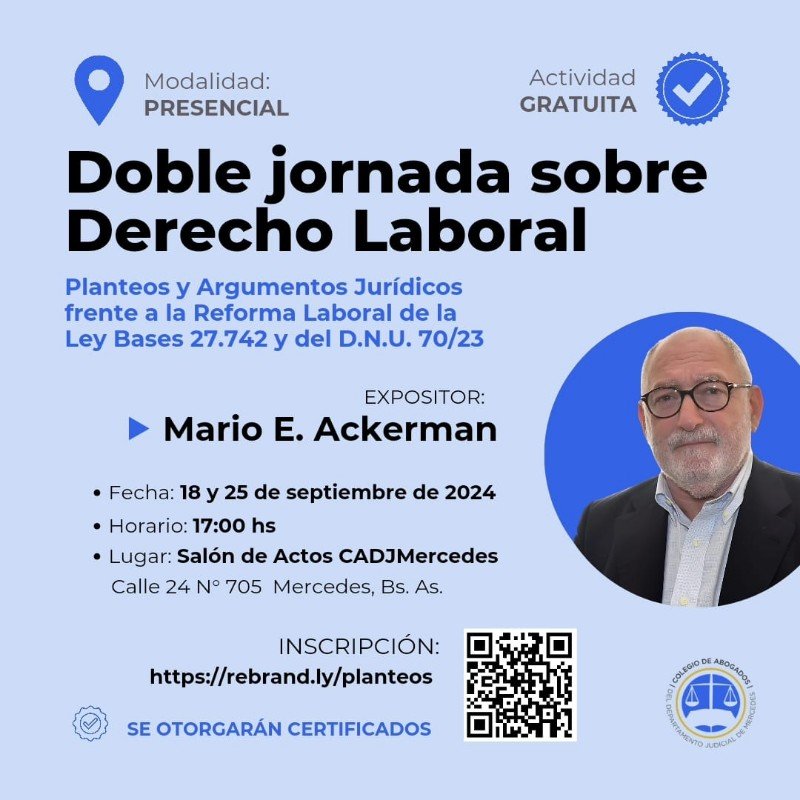 El Colegio de Abogados de Mercedes invitan a una doble Jornada de Derecho Laboral: «Planteos y Argumentos Jurídicos frente a la Reforma Laboral de la Ley Bases 27.742 y del D.N.U. 70/23». Expone del Dr. Mario E. Ackerman.