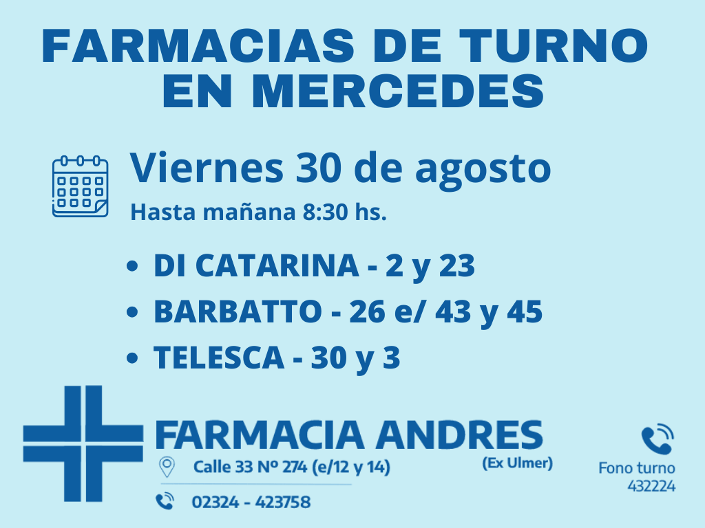 Desde las 8 30 del día de hoy hasta la misma hora de mañana las farmacias de turno en Mercedes son Di Catarina, Barbatto y Telesca