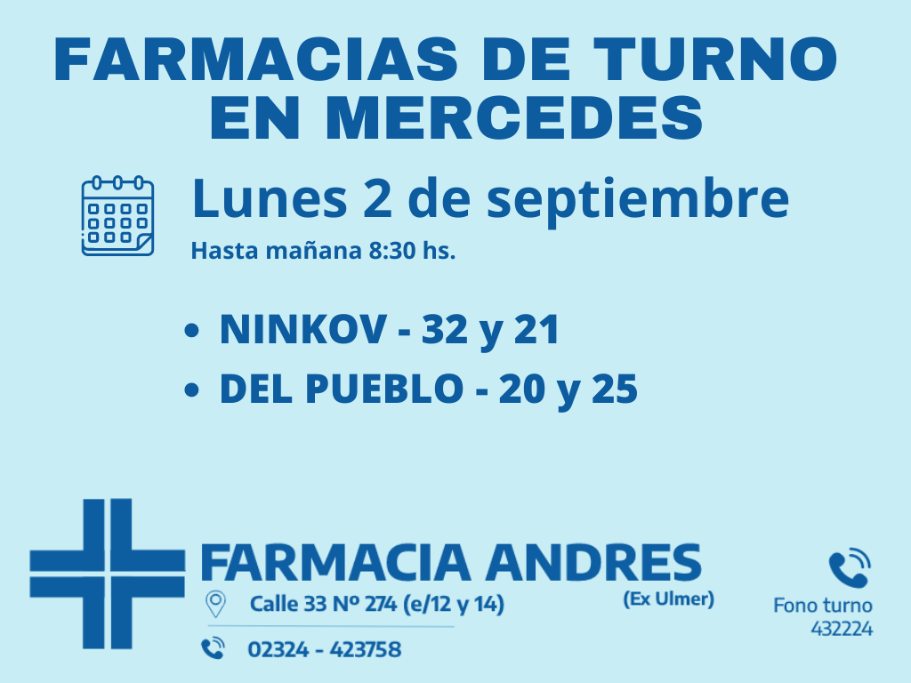 Farmacias de turno del lunes 2 de septiembre 2 septiembre, 20242 septiembre, 2024Desde las 8 30 del día de hoy hasta la misma hora de mañana las farmacias de turno en Mercedes son Ninkov y Del PuebloComparte esto: Haz clic para compartir en WhatsApp (Se abre en una ventana nueva) WhatsApp Haz clic para compartir en Telegram (Se abre en una ventana nueva) Telegram Haz clic para compartir en X (Se abre en una ventana nueva) X Haz clic para compartir en Facebook (Se abre en una ventana nueva) Facebook TE PUEDE INTERESARCOMENTARIOS Comentarios