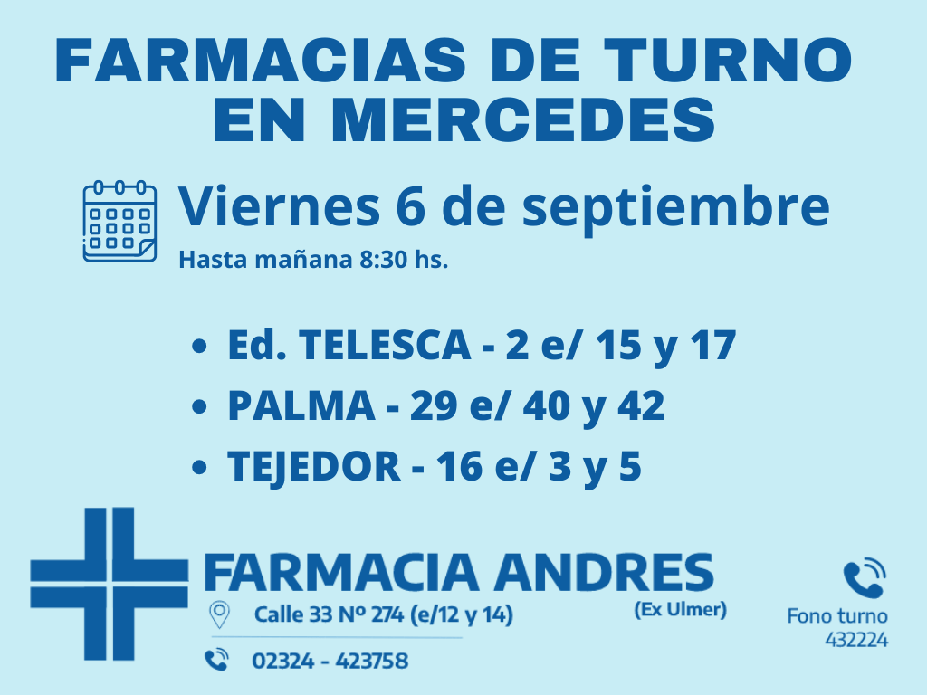 Desde las 8:30 del día de hoy hasta la misma hora de mañana, las farmacias de turno en Mercedes son: Eduardo Telesca, Palma y Tejedor.