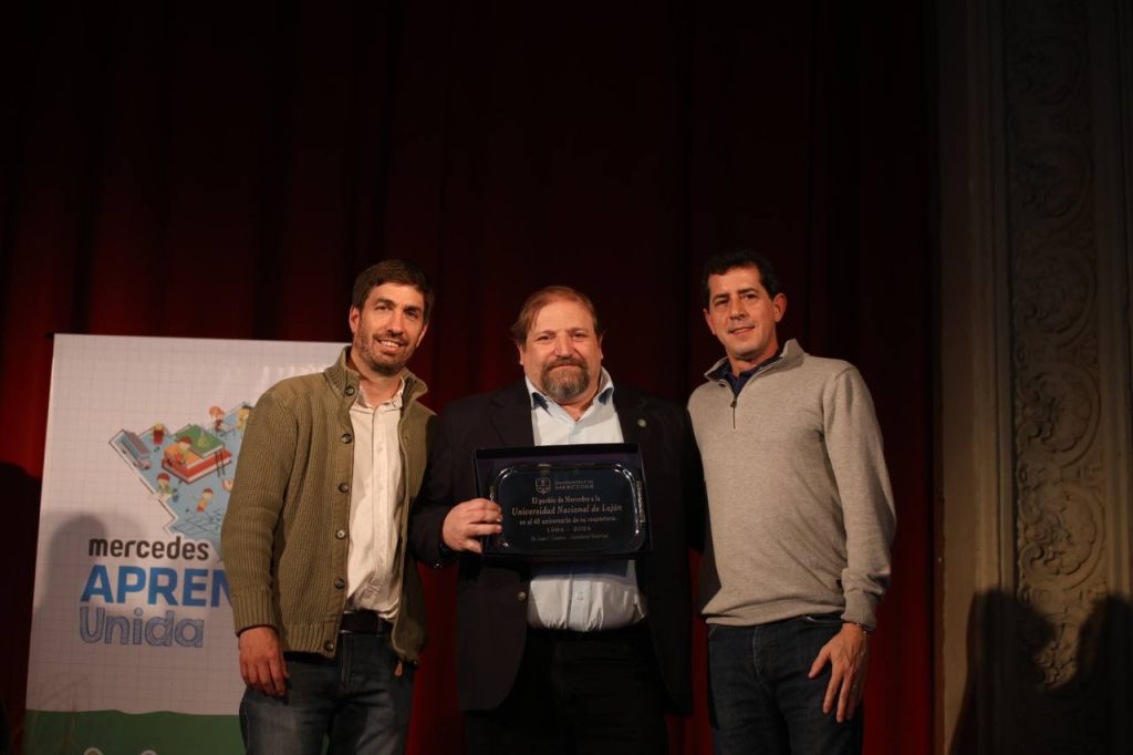El intendente Juan I. Ustarroz junto al senador nacional Eduardo “Wado” de Pedro entregaron un reconocimiento a la Universidad Nacional de Luján por el 40° aniversario de su reapertura tras haber sido cerrada por la última Dictadura Cívico Militar. Recibió su rector, el Licenciado Walter Panessi.