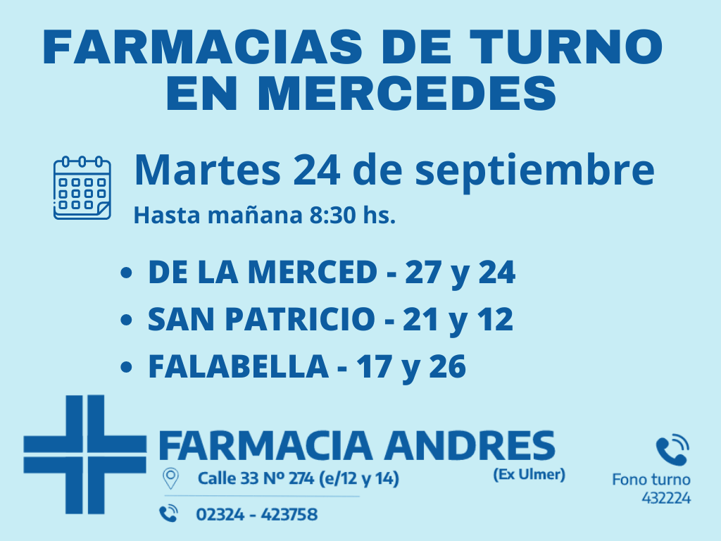 Desde las 8;30 del día de hoy hasta la misma hora de mañana, las farmacias de turno en Mercedes: De la Merced, San Patricio y Falabella.
