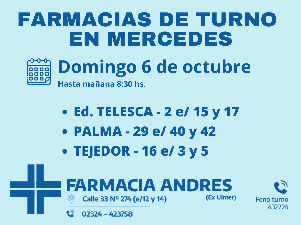 Desde las 8:30 del día de hoy hasta la misma hora de mañana, las farmacias de turno en Mercedes son: Eduardo Telesca, Palma y Tejedor.