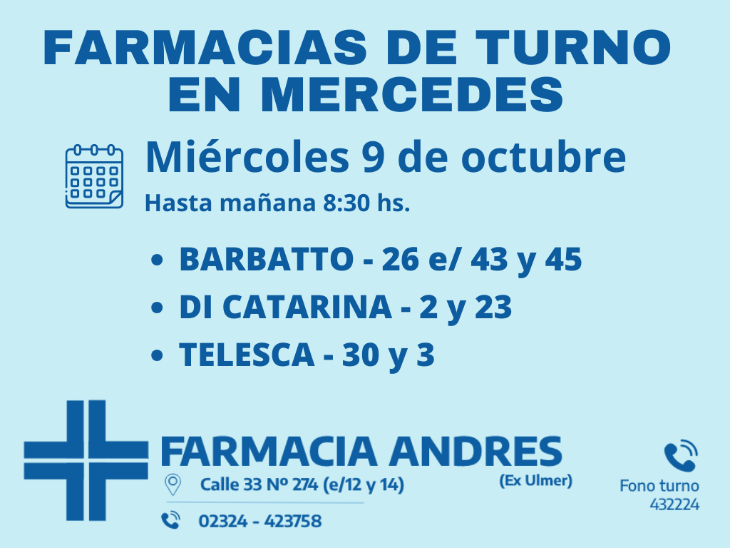 Desde las 8:30 del día de hoy hasta la misma hora de mañana las farmacias de turno en Mercedes son Barbatto, Di Catarina y Telesca
