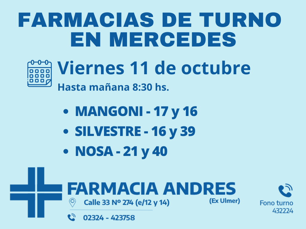 Desde las 8:30 del día de hoy hasta la misma hora de mañana, las farmacias de turno en Mercedes son: Mangoni, Silvestre y Nosa.