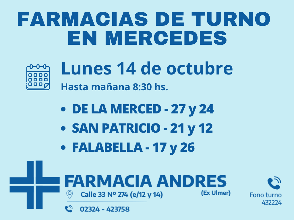 Desde las 8 30 del día de hoy hasta la misma hora de mañana las farmacias de turno en Mercedes son De La Merced, San Patricio y Falabella