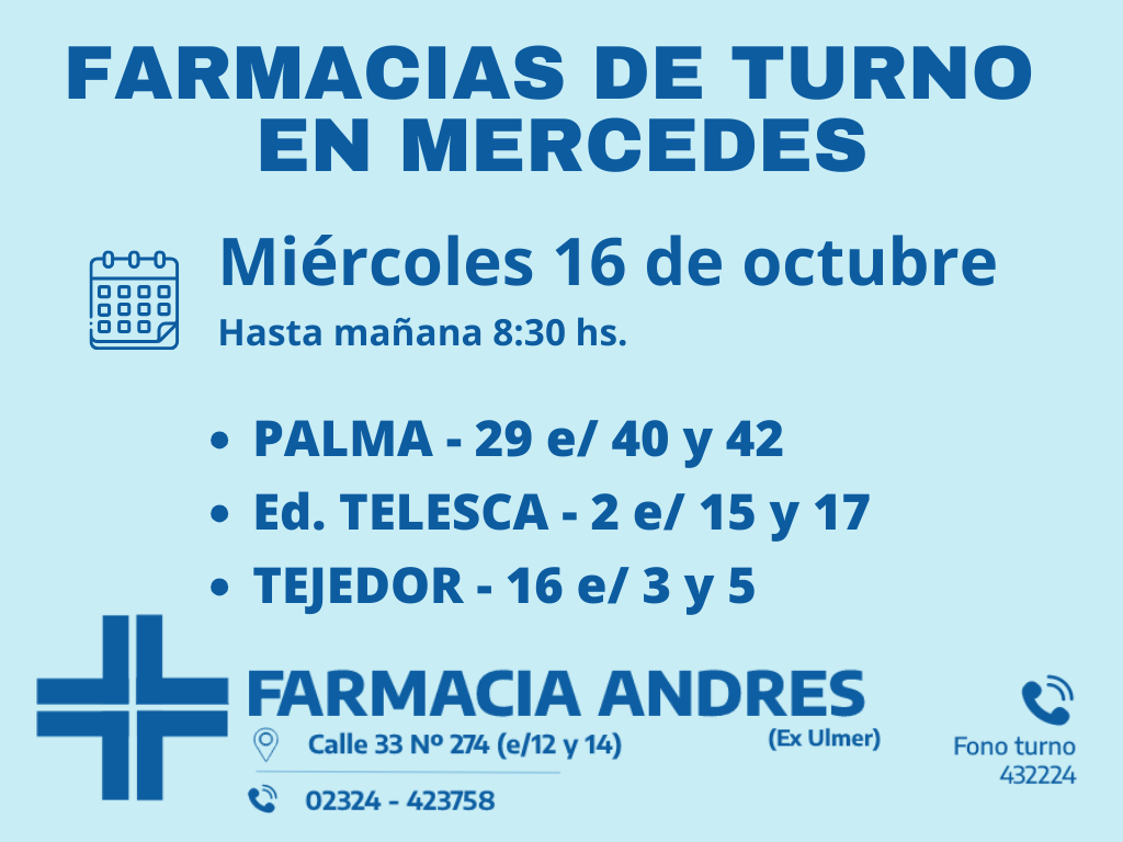 Desde las 8;30 del día de hoy hasta la misma hora de mañana, las farmacias de turno en Mercedes son: Palma, Eduardo Telesca, y Tejedor.