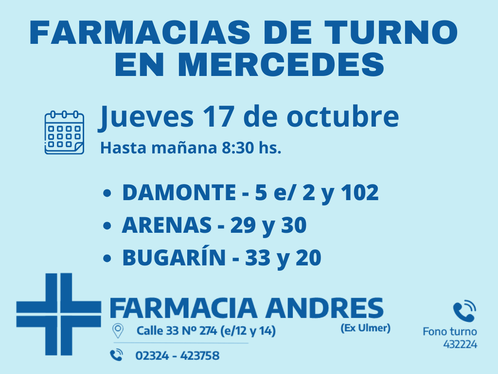 Desde las 8:30 del día de hoy hasta la misma hora de mañana, las farmacias de turno en Mercedes son: Damonte, Arenas y Bugarín.