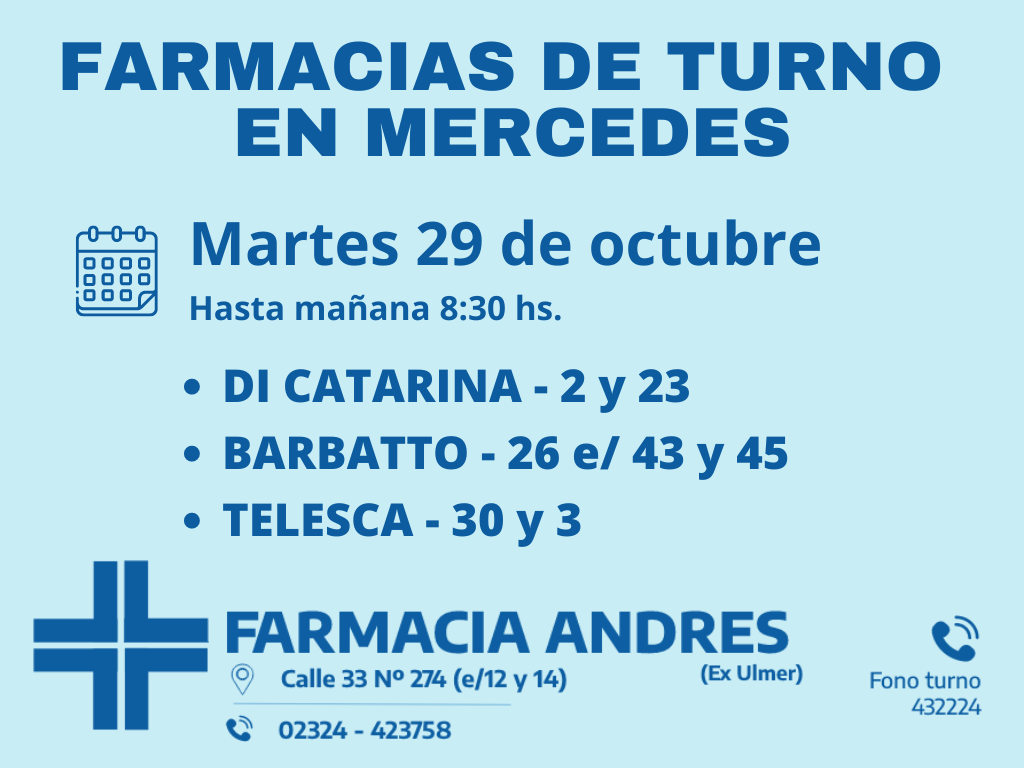 Desde las 8;30 del día de hoy hasta la misma hora de mañana las farmacias de turno en Mercedes son: Di Catarina, Barbatto y Telesca.