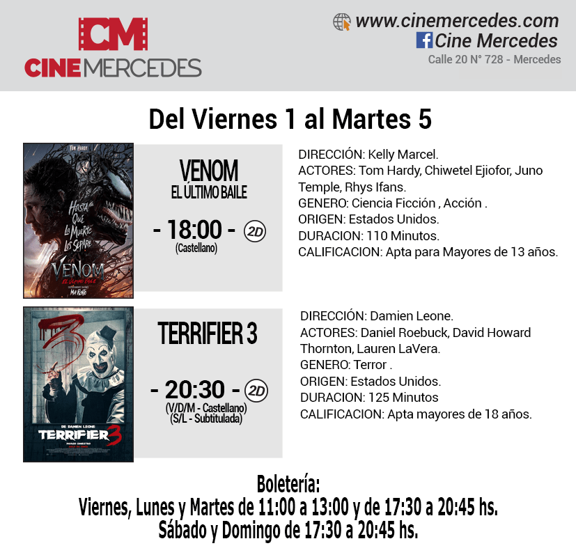 Desde el viernes 1 al martes 5 de noviembre, el Cine Mercedes presenta acción y terror en su pantalla. Por segunda semana, esta Venom en las funciones de la hora 18 y en semana del terror, 20:30 hs, proyectan Terrifier 3.